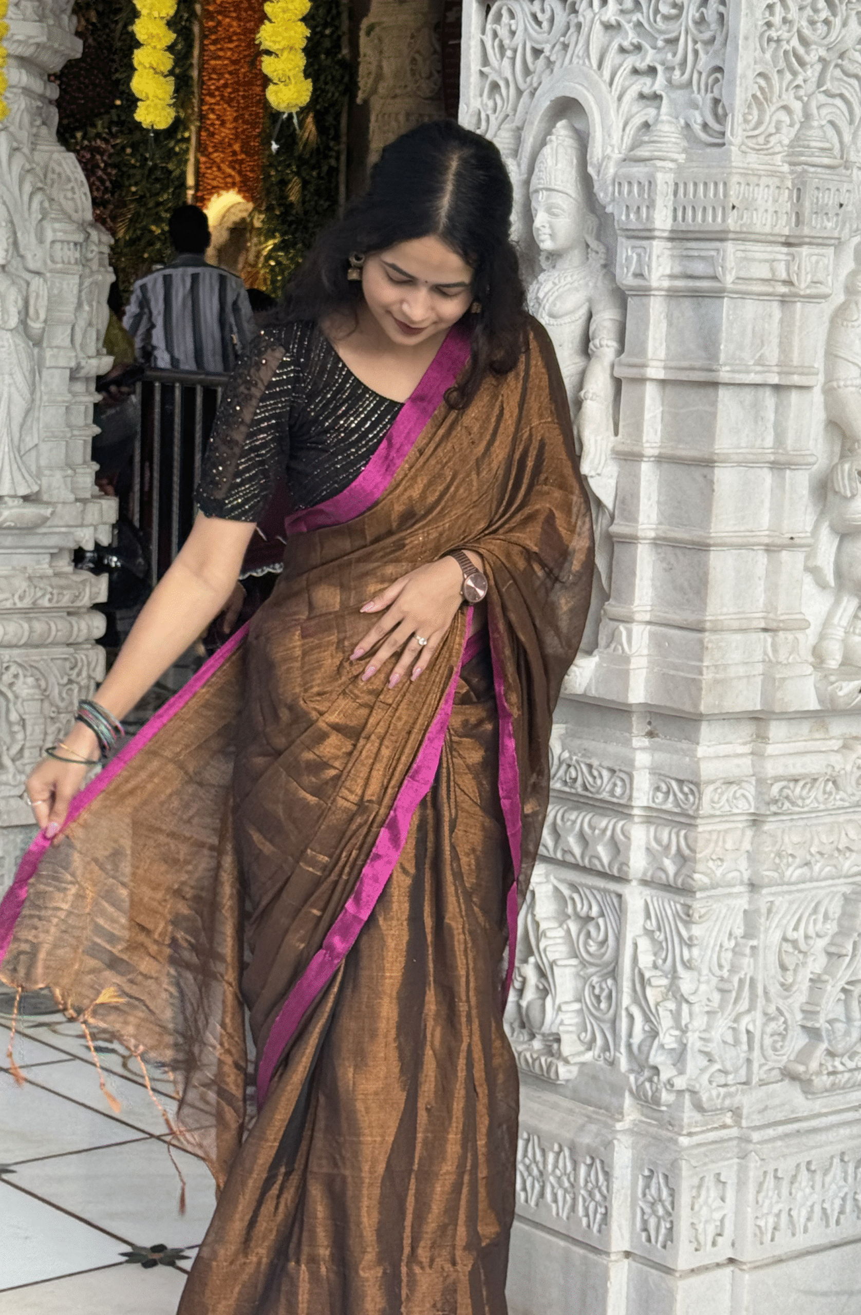 Drape yourself in the allure of luxury with this Copper Gold Tissue Saree. The warm copper tone, accentuated by rich golden shimmer, creates a stunning visual appeal. Its smooth texture and perfect fall make it ideal for grand celebrations, festive nights, and traditional events. The contrasting magenta border adds depth and vibrance, making it an eye-catching ensemble. Pair it with statement jewelry and bold lips for an unforgettable ethnic look. A timeless creation from Kohinoor Closet, this saree is designed to make every occasion shine brighter.