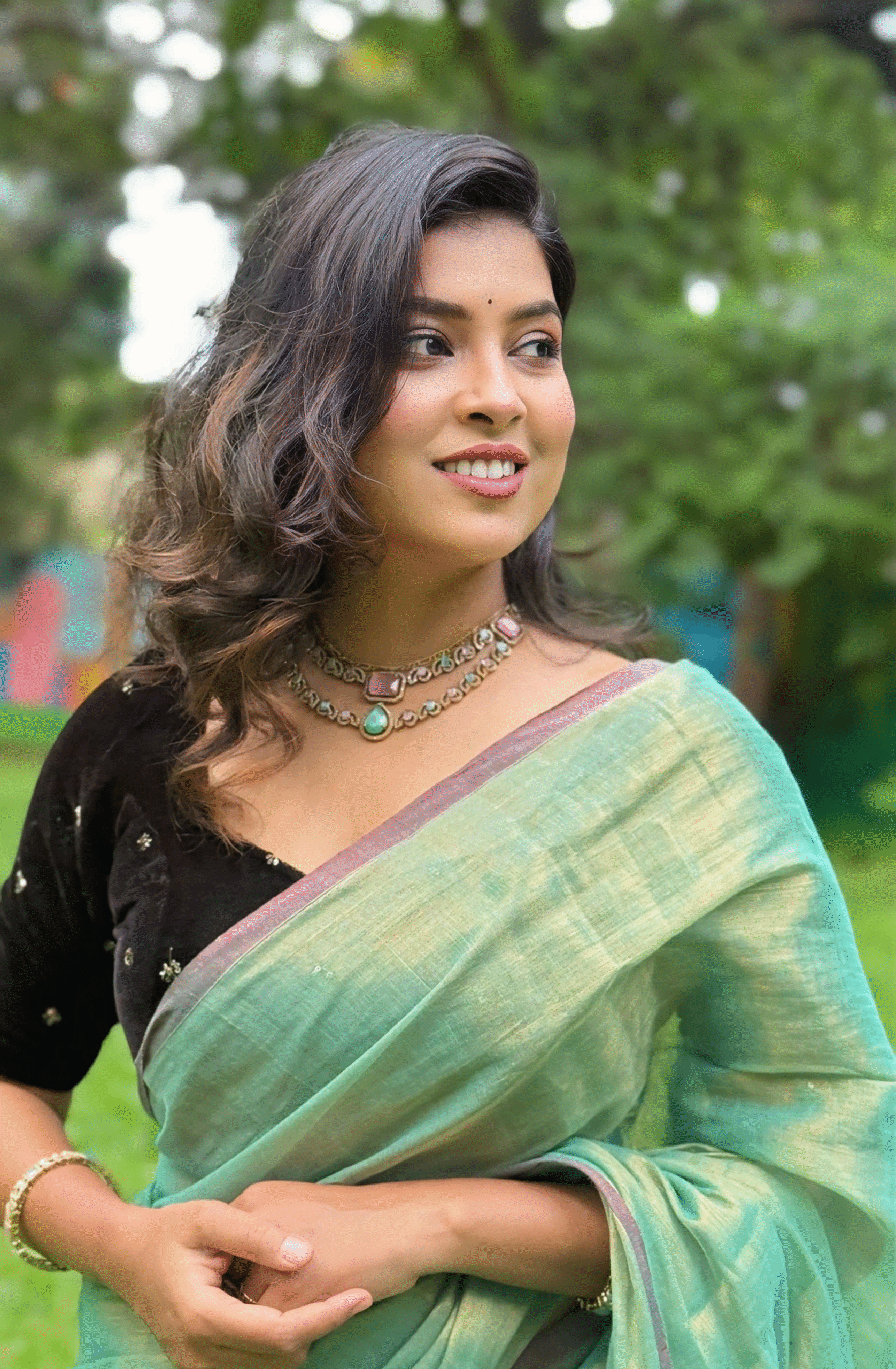 A perfect blend of modern pastel tones and traditional artistry, this Pista Green Tissue Saree captures effortless grace. The soft tissue fabric gives it a luminous glow, while the soothing pista shade adds a refreshing touch to your ethnic ensemble. Ideal for daytime celebrations, festive lunches, or light evening gatherings, this saree radiates subtle sophistication. Pair it with minimal jewelry and a soft bun to enhance its elegant charm. Designed for women who love understated luxury, this saree from Kohinoor Closet makes every moment memorable.