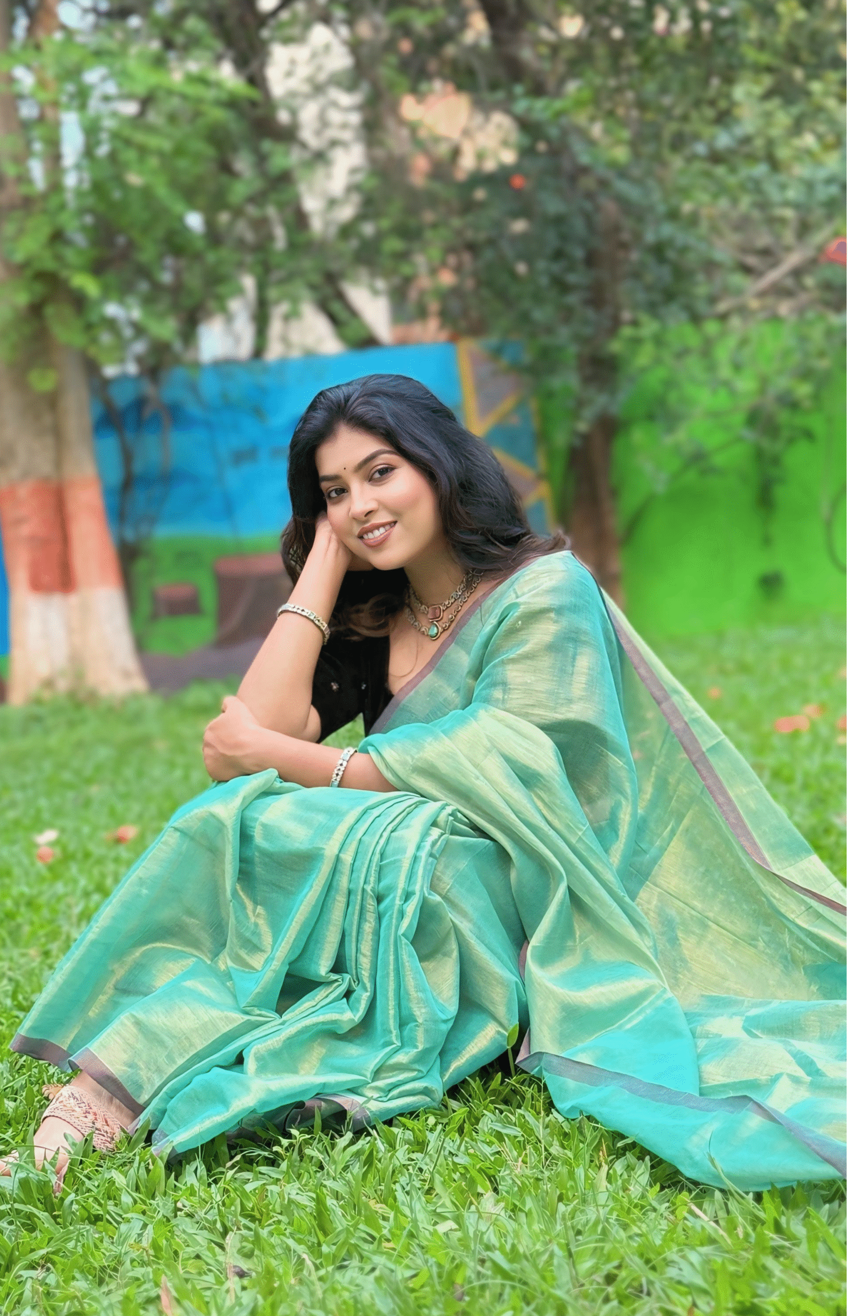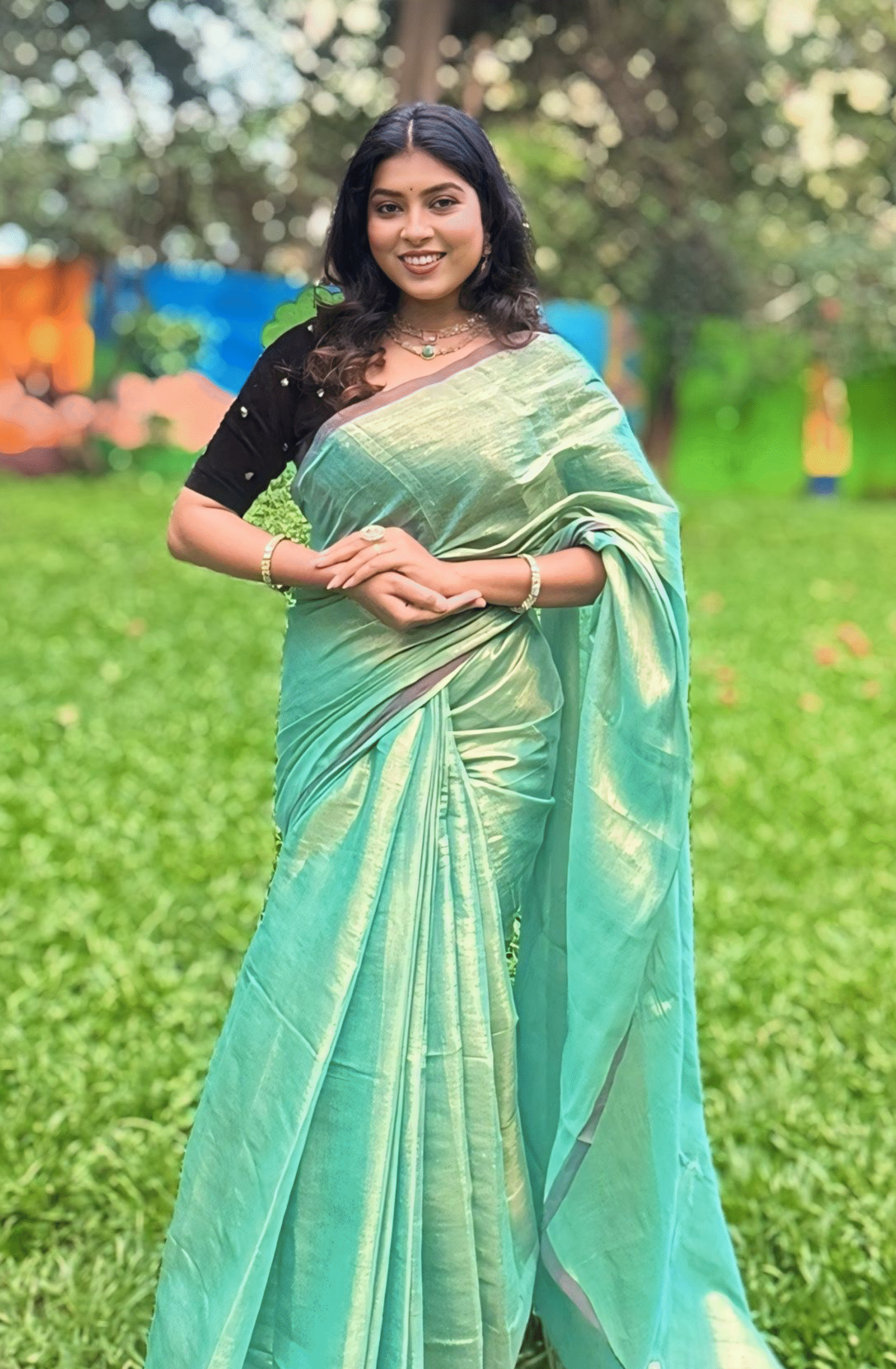 The Pista Green Tissue Saree blends elegance with comfort. Its refreshing pastel hue and soft shimmer make it ideal for daytime festivities, weddings, and celebrations where subtle luxury makes a statement.